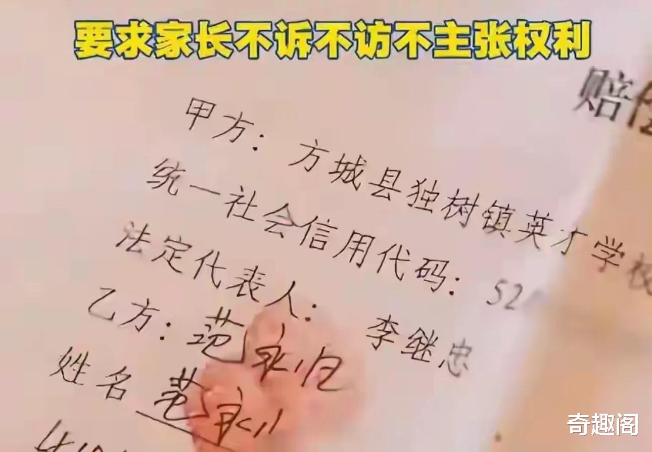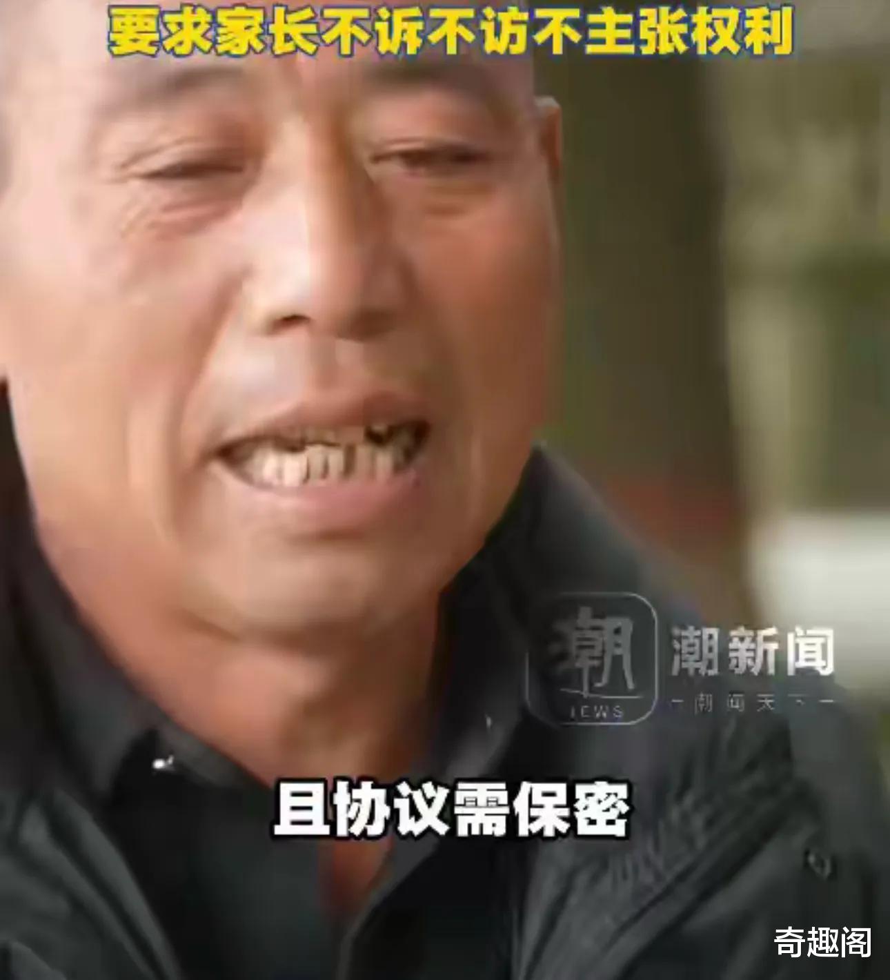 内容是学校将支付一笔涵盖死亡赔偿金、丧葬费、精神抚慰金等多项费用的赔偿金。协议中有这样的说法,家属收到赔偿金之后不得再主张任何权利,也不得干扰学校秩序,而且还必须做到“不诉不访”,最重要的是还需要对协议内容保密。