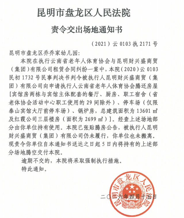 2021年,盘龙区人民法院作出(2020)云0103民初1732号民事判决,判令被告昆明财兴盛商贸(集团)有限公司于本判决生效之日起十日内将涉案房屋[包括合同中约定的宾馆房两栋与宾馆主体配套的餐厅、厨房、职工宿舍(省老体协会活动中心职工使用的29间除外)、停车场(仅限泰山宾馆大厅前停车场)、锅炉房,总建筑面积为13601平方米及红霞公司三层楼房(面积为2699平方米)]腾还给原告云南省老年人体育协会;2025年,法院向乔乔幼儿园发出《责令交出场地通知书》((2021)云0103执2171号),要求其在5日内腾空所使用场地。乔乔幼儿园对此提出异议:一是并非案件当事人,乔乔幼儿园并非判决书中的被执行人,也未参与省老体协与财兴盛公司的合同纠纷;二是租赁合同合法有效,乔乔幼儿园与泰山宾馆签订的租赁合同真实、合法,且签订时间早于纠纷发生;三是执行范围不明确,乔乔幼儿园指出,文艺路49号院内共有7栋独立建筑,法院未能明确认定哪一栋属于判决范围内的资产,也无证据证明该资产已实际交付财兴盛公司;四是独立法人行为未被认可,泰山宾馆作为独立法人,其对外签订租赁合同的行为,在司法执行中被认定为财兴盛公司的转租行为,乔乔幼儿园对此表示强烈异议。