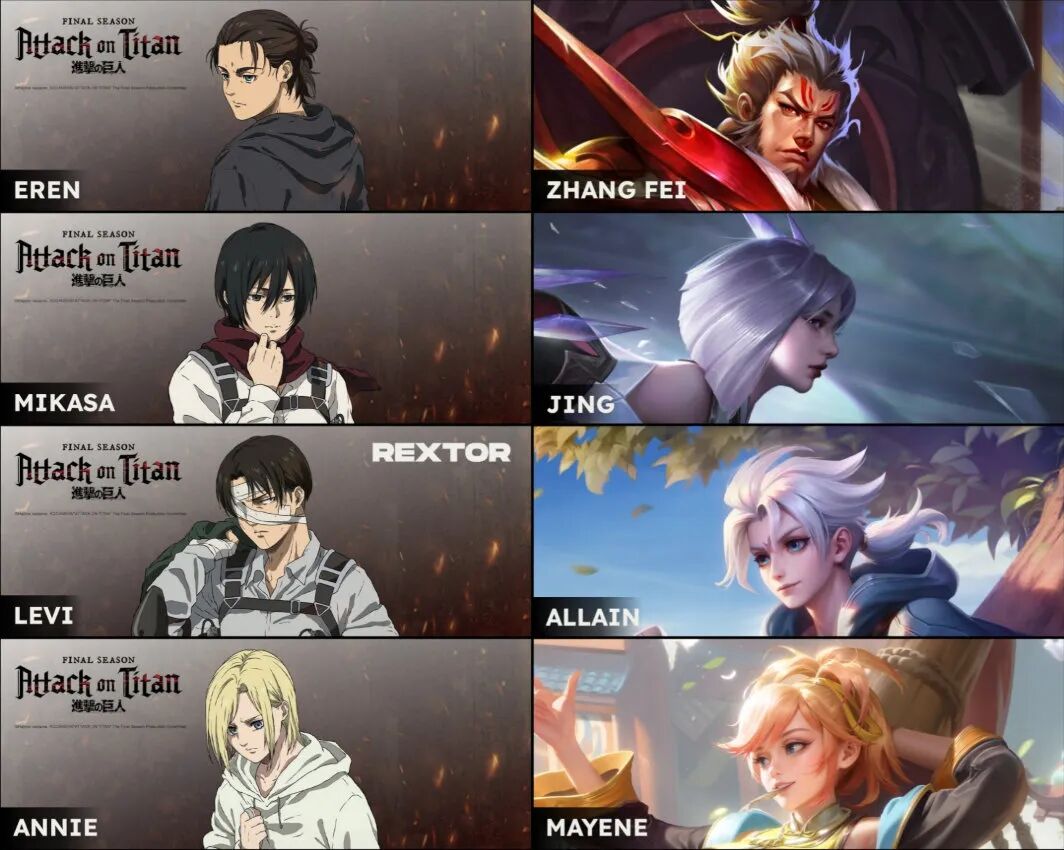 而王者荣耀国际服与进击的巨人的联动,一共有五款皮肤。目前已经有四款皮肤正式揭晓,分别是张飞-艾伦·耶格尔、镜-三笠·阿克曼、亚连-利威尔·阿克曼、姬小满-阿尼·利昂纳德。此外,还会有一款勇者品质的活动皮肤,据传是会给海诺,具体是什么,暂时不知道,可能只是原创的小杂兵。这是每一次漫画联动都会安排的额外环节。