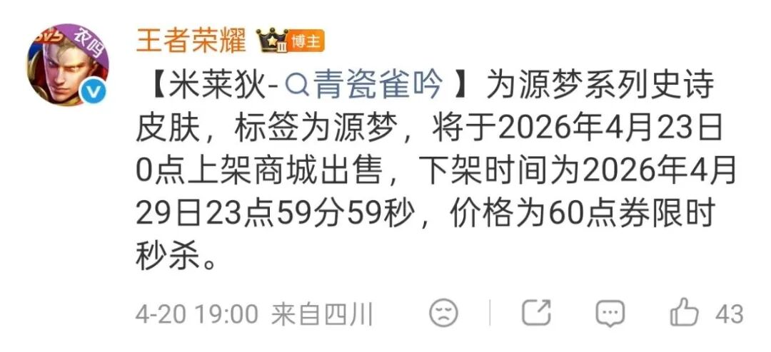 米莱狄源梦皮肤【青瓷雀吟】,将于4月23日,也就是本周四上线,首周是秒杀登场,喜欢这款皮肤的不要错过。不得不说,这款皮肤的创意还是挺不错的。麻将小机器人,充满麻将味道的台词等等。现在麻将玩法即将常驻,还是很应景的。而米莱狄源梦皮肤确定是秒杀登场后,那么刘禅的源梦皮肤则应该就是在礼册之中登场了。