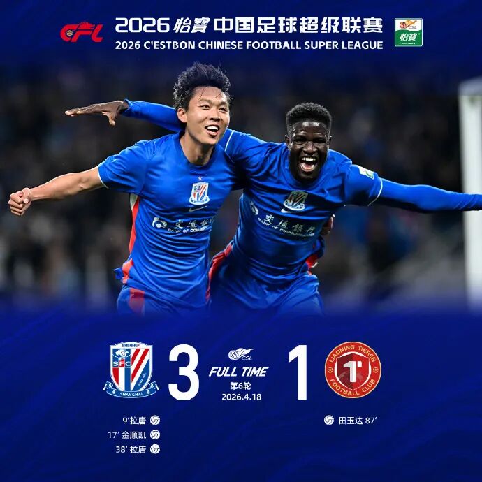 4月18日晚上,2026赛季中超联赛第6轮结束最后两场比赛。大连英博主场2比1逆转河南队,收获四连胜稳居积分榜第三。上海申花则在主场3比1轻取升班马辽宁铁人,收获联赛三连胜,赛季至今4胜2平保持不败。对于带着负10分起步的申花而言,这场胜利的意义远不止三分。追分势头猛烈,超越未扣分球队一步之遥赛季初,因涉及历史案件,申花被扣除10个联赛积分,与天津津门虎并列受罚最重的球队。开季负分垫底的局面,让外界对这支传统劲旅的前景普遍看衰。