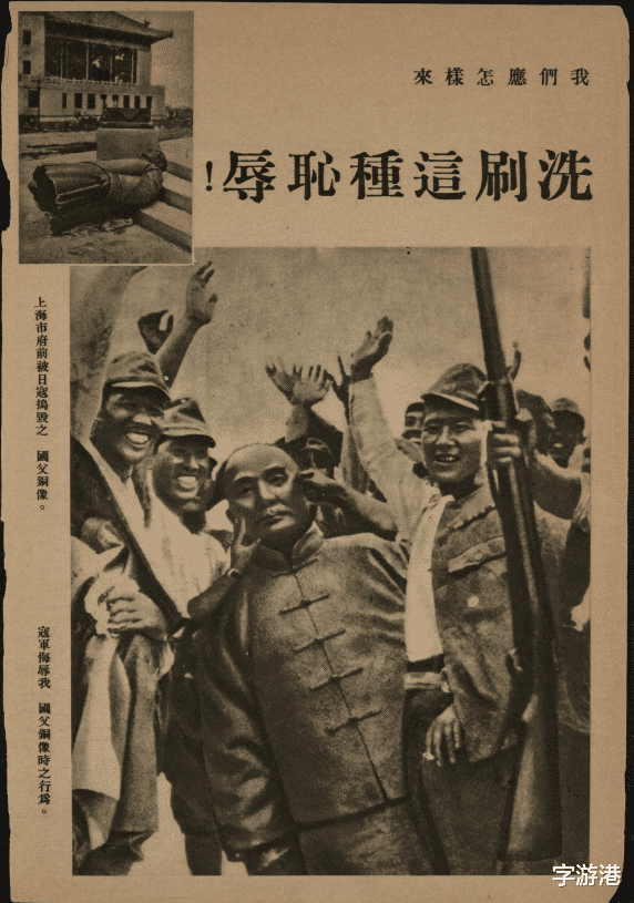 ▼上海市政府前,国父铜像被日军侮辱捣毁