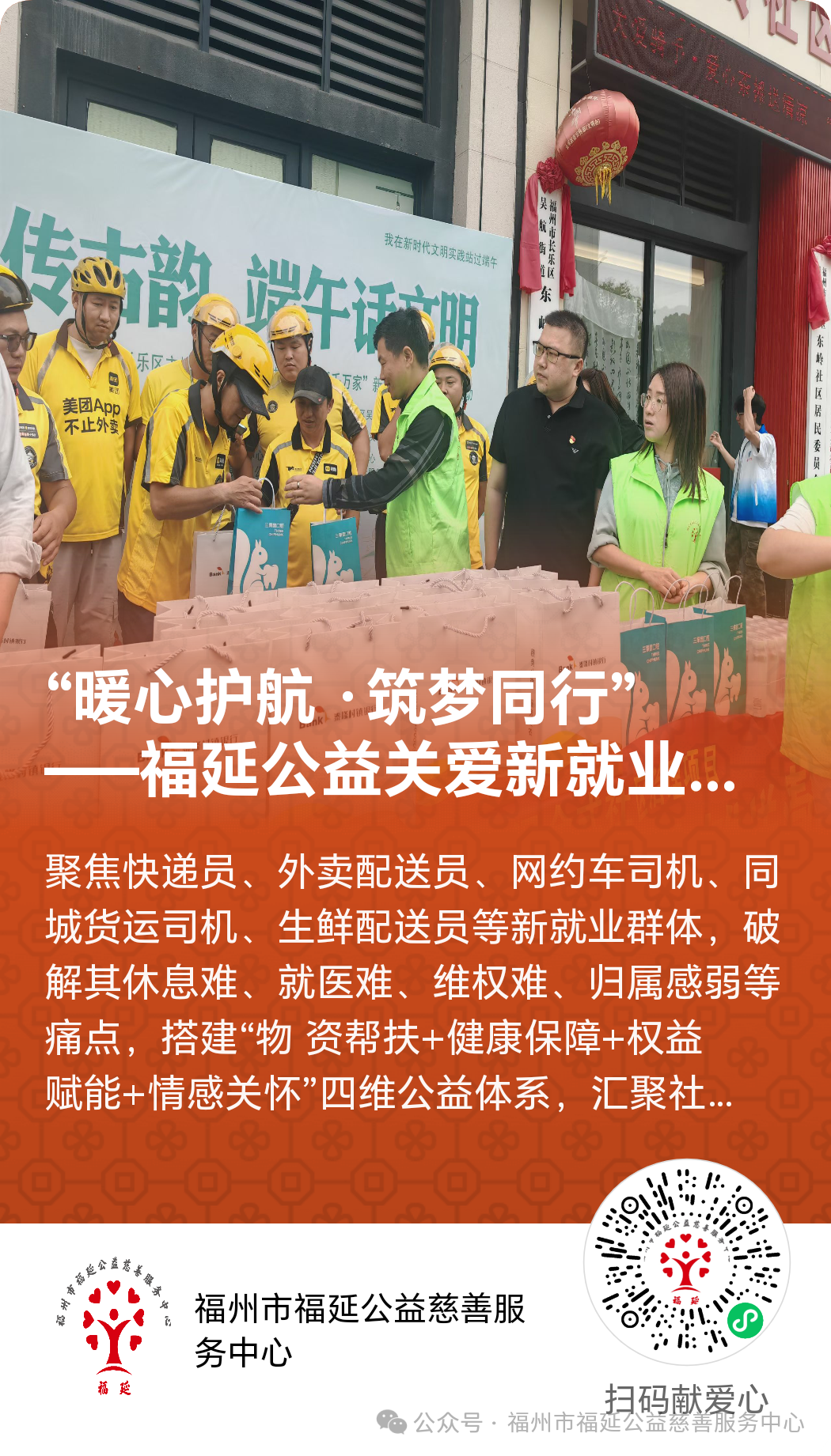 2025年6月,福延公益启动“暖新送清凉”系列活动,单场启动仪式即向100名新就业群体代表发放总价值22万元的清凉物资礼包,涵盖防暑药品、能量补给、生活必需品等急难愁盼物资,为高温下坚守岗位的他们撑起“清凉保护伞” ;8月,仓山区、晋安区同步开展专场慰问,累计发放300份暖心礼包,每份礼包包含价值500元物资、特色农产品及健康补给,同步配套医疗义诊服务,福建省妇幼保健院专家团队为新就业群体提供免费健康筛查,用专业守护健康底线;截至2025年10月,全年累计为1600余名外卖骑手、快递员、一线交巡警等群体发放防暑降温礼包,物资总价值超50万元,用实际行动筑牢“温暖防线” 。