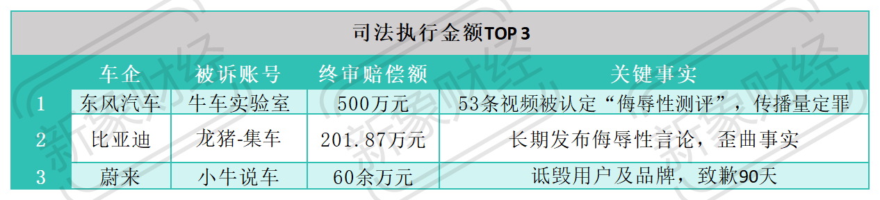 2 东风汽车案创司法赔偿纪录根据检索到的司法判决信息,在车企起诉自媒体的终审判决中,东风汽车诉“牛车实验室”案以500万元赔偿金额位列榜首,创下迄今全国同类型纠纷的最高执行金额。在相应的判决中,法院强调,自媒体非普通消费者,更应尽到审慎注意义务。