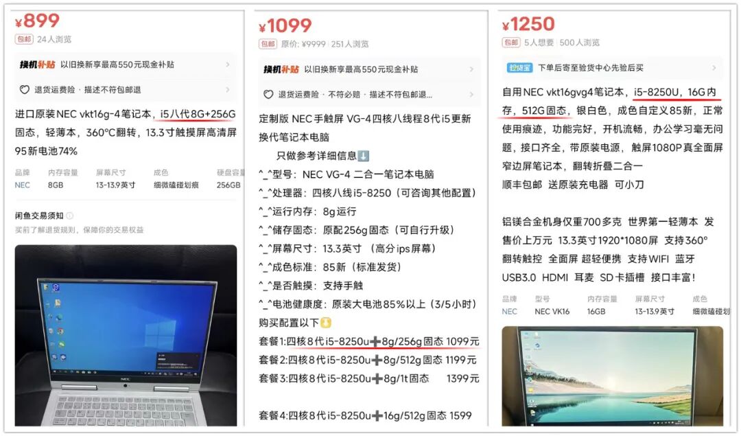 至于目前的二手价,我简单搜了一下,八代i5+8G+256G配置最低899元,16G+512G配置最低1250元。我前年嫌8G板载内存太小给卖了,打算等16G降到一千再买回来,如今不出差很少用笔记本,也就祛魅了。