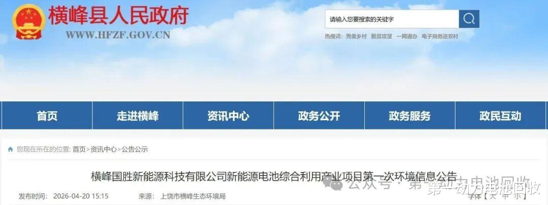 第一动力电池回收消息,近日,上饶市横峰生态环境局发布了《横峰国胜新能源科技有限公司新能源电池综合利用产业项目》第一次环境信息公告。