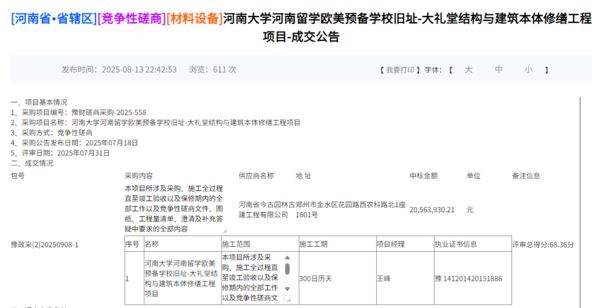 (河南大学河南留学欧美预备学校旧址-大礼堂结构与建筑本体修缮工程项目成交公告)