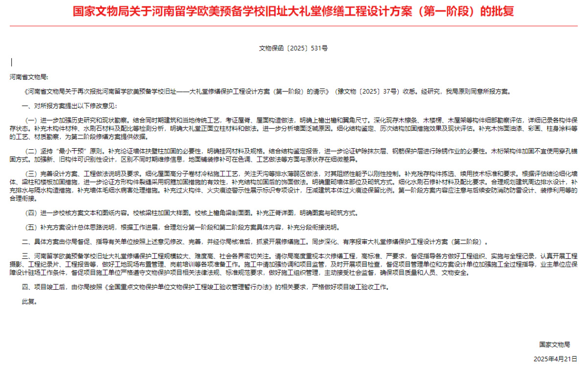 记者从国家文物局综合行政管理平台查询得知,4月21日,国家文物局对河南留学欧美预备学校旧址大礼堂修缮工程设计方案(第一阶段)进行了批复,批复中提到该局原则同意所报方案,并对方案提出以下修改意见:进一步加强历史研究和现状勘察;坚持“最小干预”原则;完善设计方案、工程做法说明及要求;进一步校核方案文本和图纸内容;补充方案设计总体思路说明,根据工作进展,合理划分第一阶段和第二阶段方案具体内容,补充分段衔接说明等。