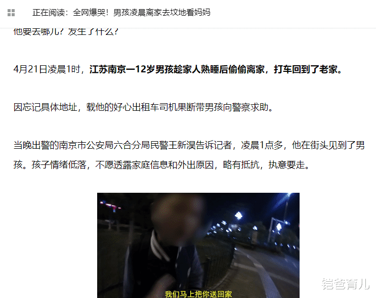 世上只有妈妈好,有妈的孩子像个宝,没妈的孩子像根草。妈妈在,家在,妈妈没了,家就是不完整的。4月21日凌晨南京的街头,一名12岁的男孩趁家人熟睡之际,独自一人偷偷就出门想打车回老家,因为说不清楚具体地址,的士司机向警方求助,男孩情绪低落,不愿透露家庭信息,在和民警一同前往派出所途中孩子终于开口说了一句让人鼻子一酸的话,“我就想……去妈妈坟上看看。”这句话让时间瞬间凝固。