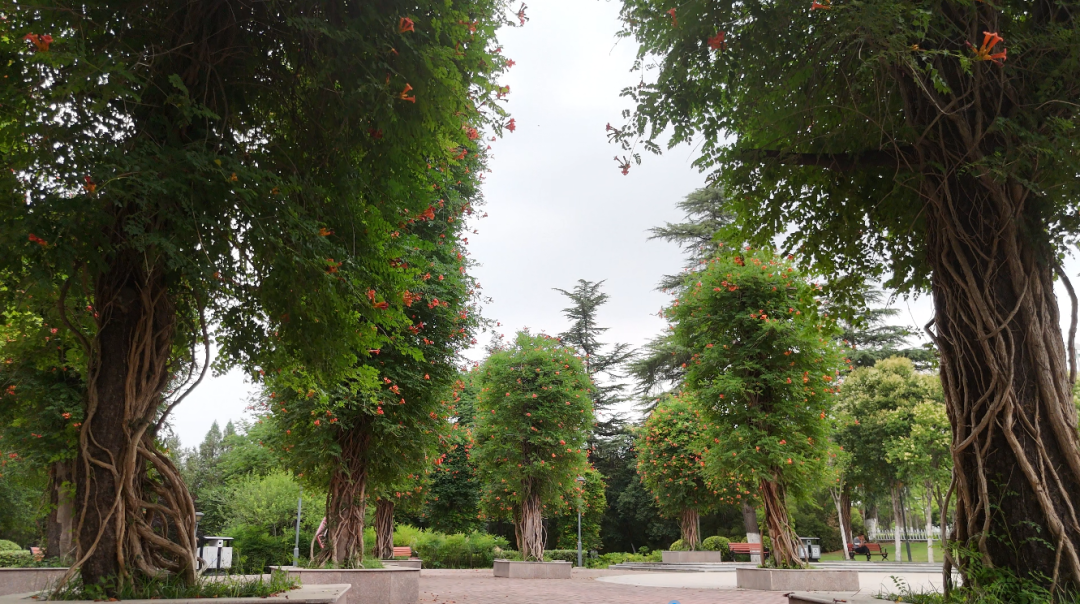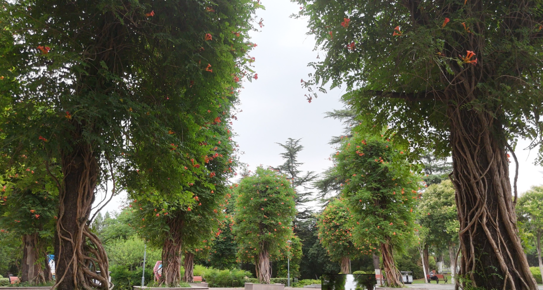 每棵老木上的凌霄藤蔓造型不一,高低不同,有一株造型如爱心,美不胜收。