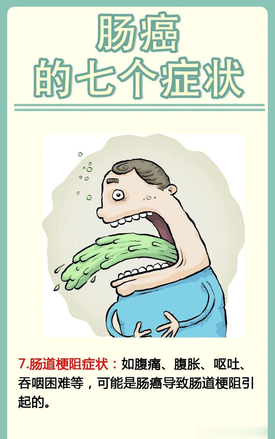 7. 肠道梗阻症状:如腹痛、腹胀、呕吐、吞咽困难等,可能是肠癌导致肠道梗阻引起的。#教你如何来看病##忆果缘1971##健康科普##医学科普#