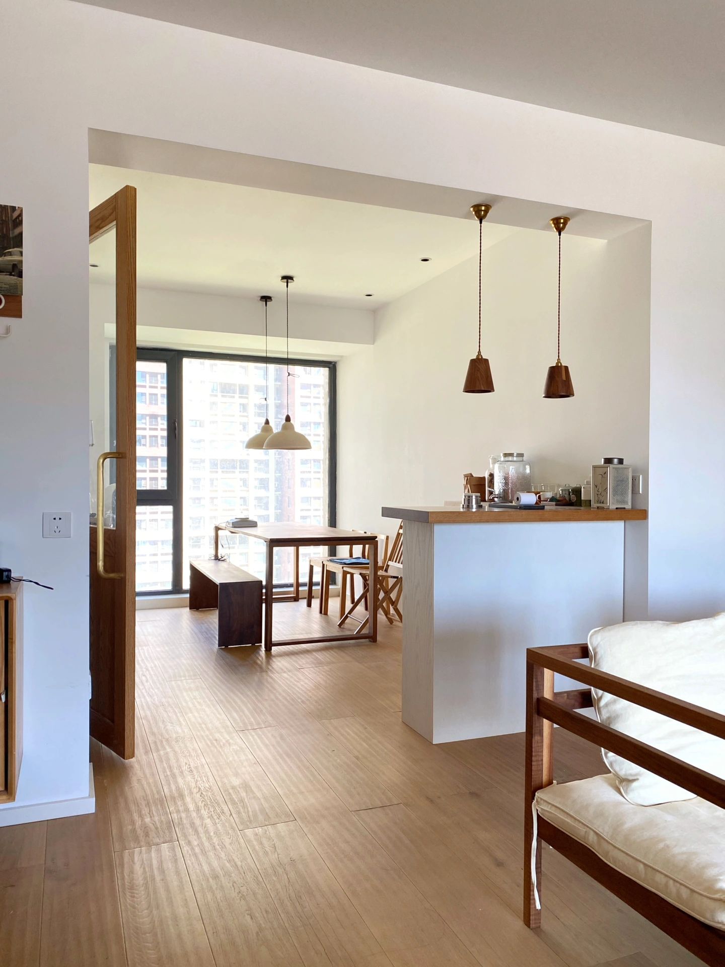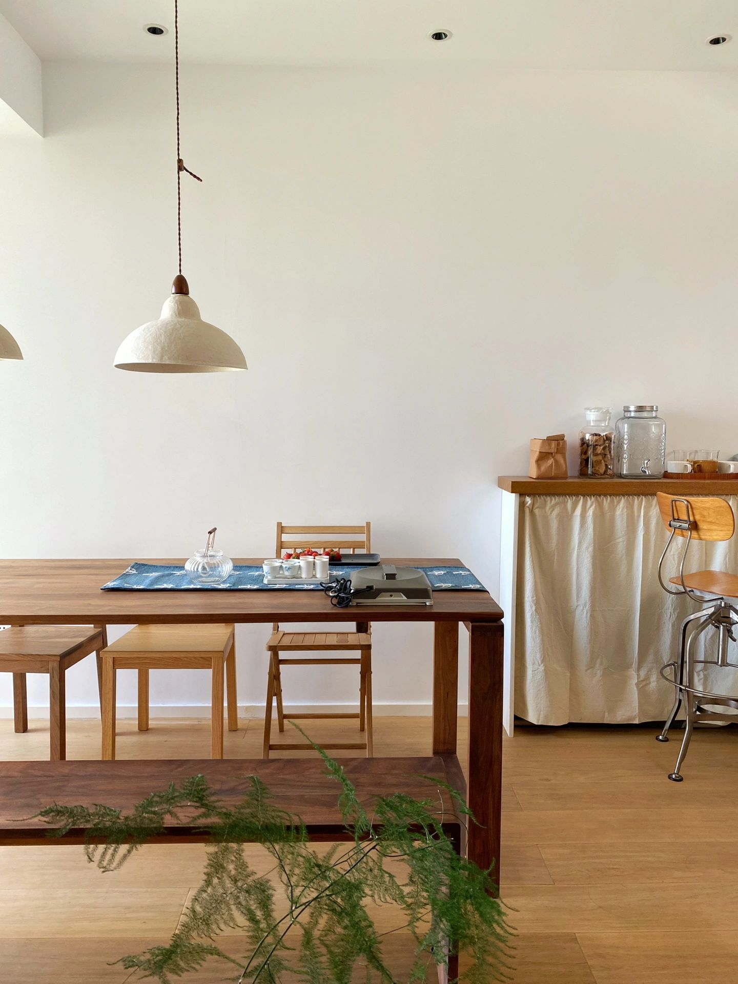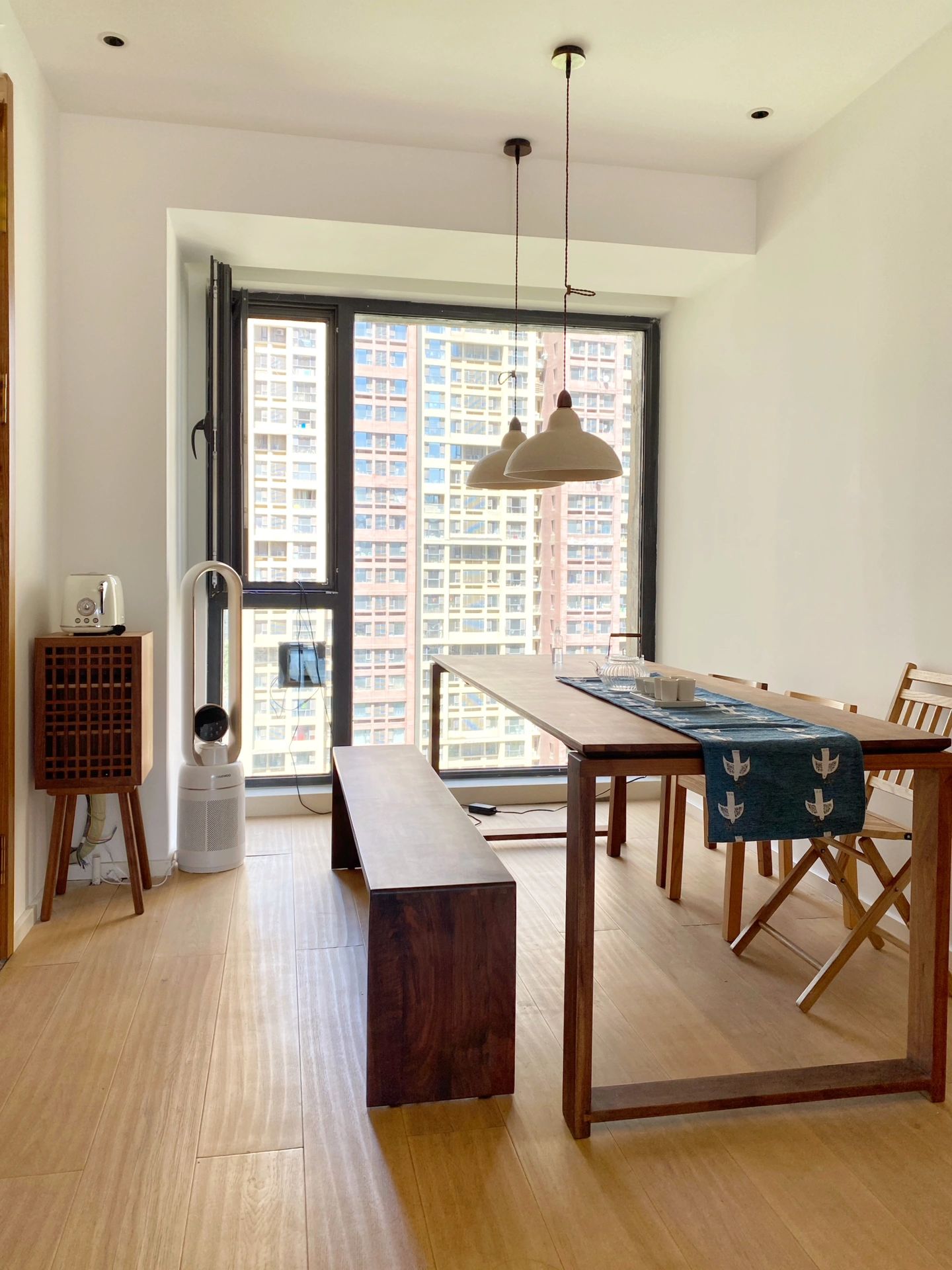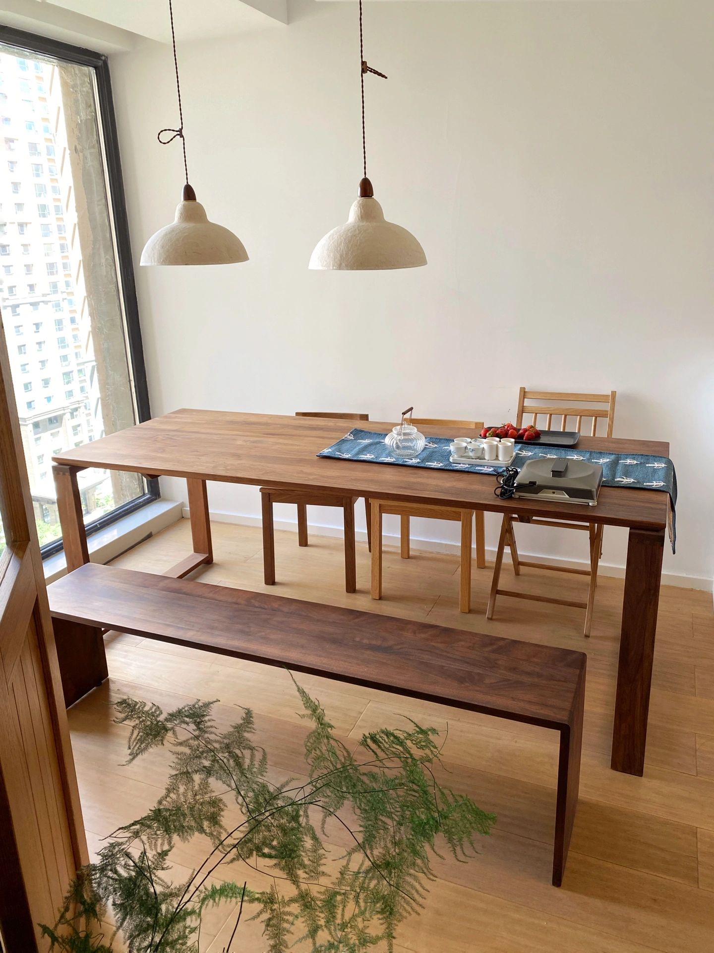 如果选择6把靠背椅,一是影响厨房开门和过道空间,而是视觉上重复且拥堵,所以我在靠近厨房的一侧选择了长椅,这样不仅不占空间,节省成本,而且相对靠背椅视觉更通透。