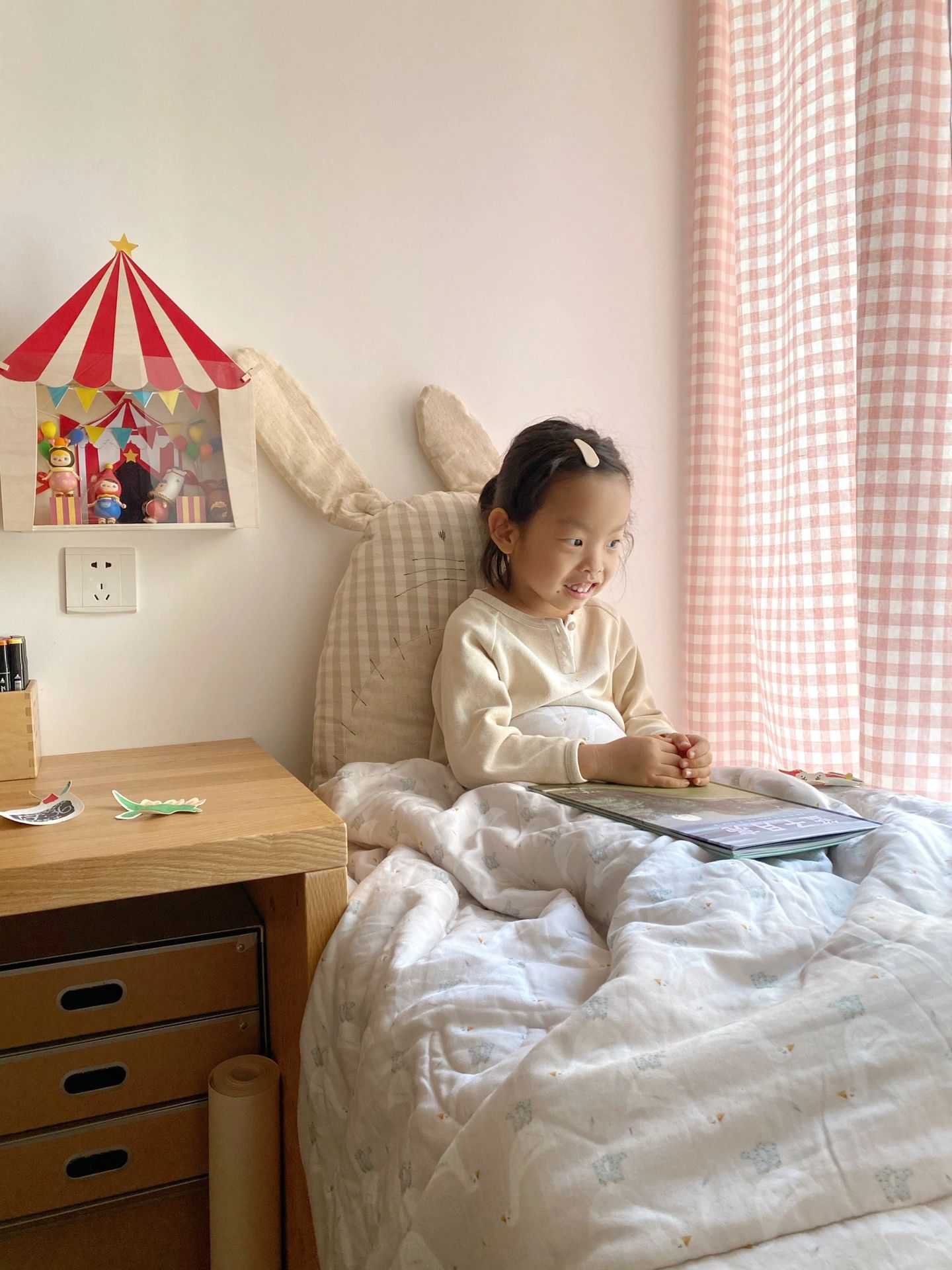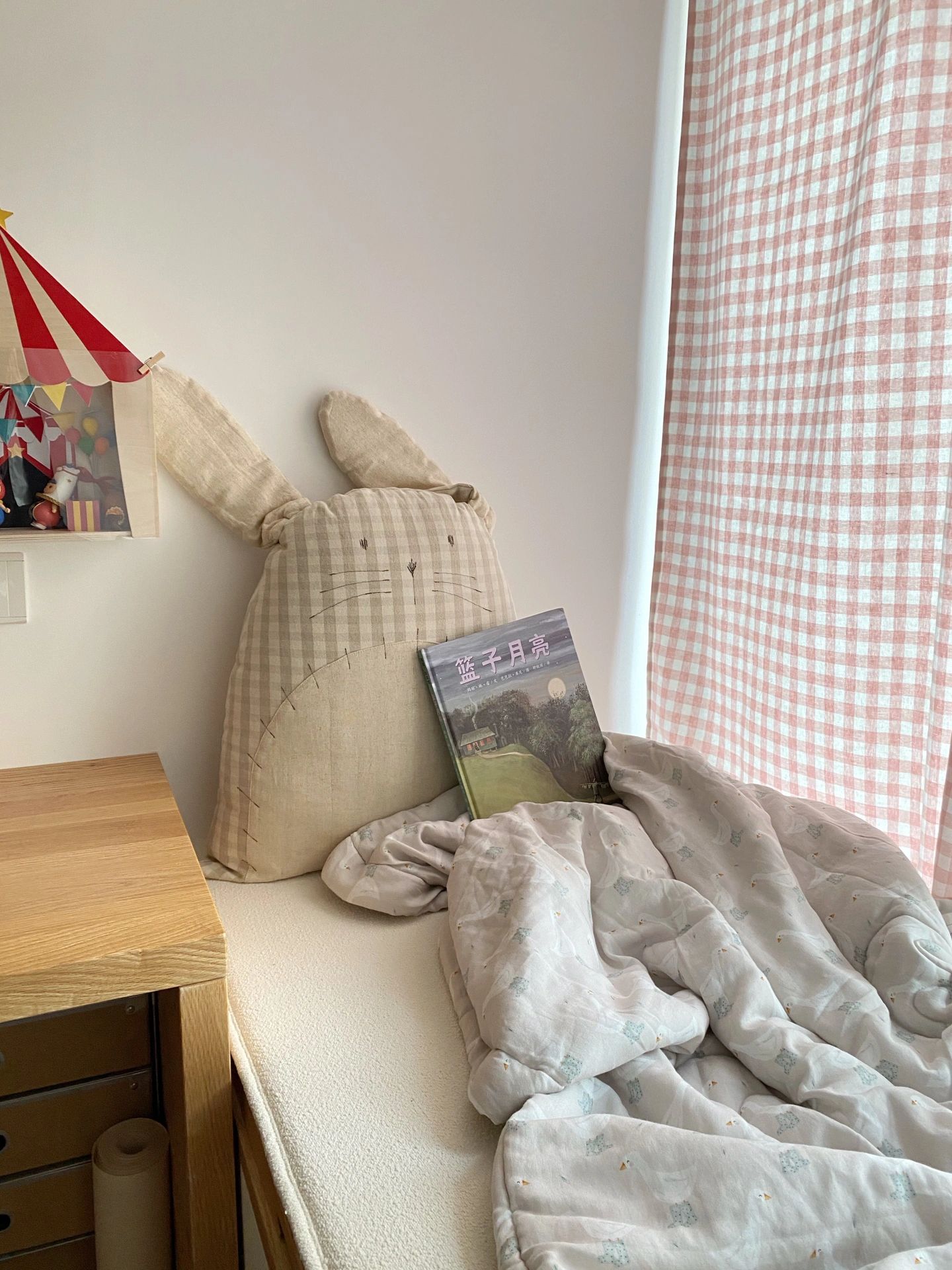搭配软软糯糯的小被子,自己DIY的粉格子窗帘,和奶白飘窗垫,整个角落都奶敷敷的好温暖,自己一个人窝在这里看书不要太有气氛啦~