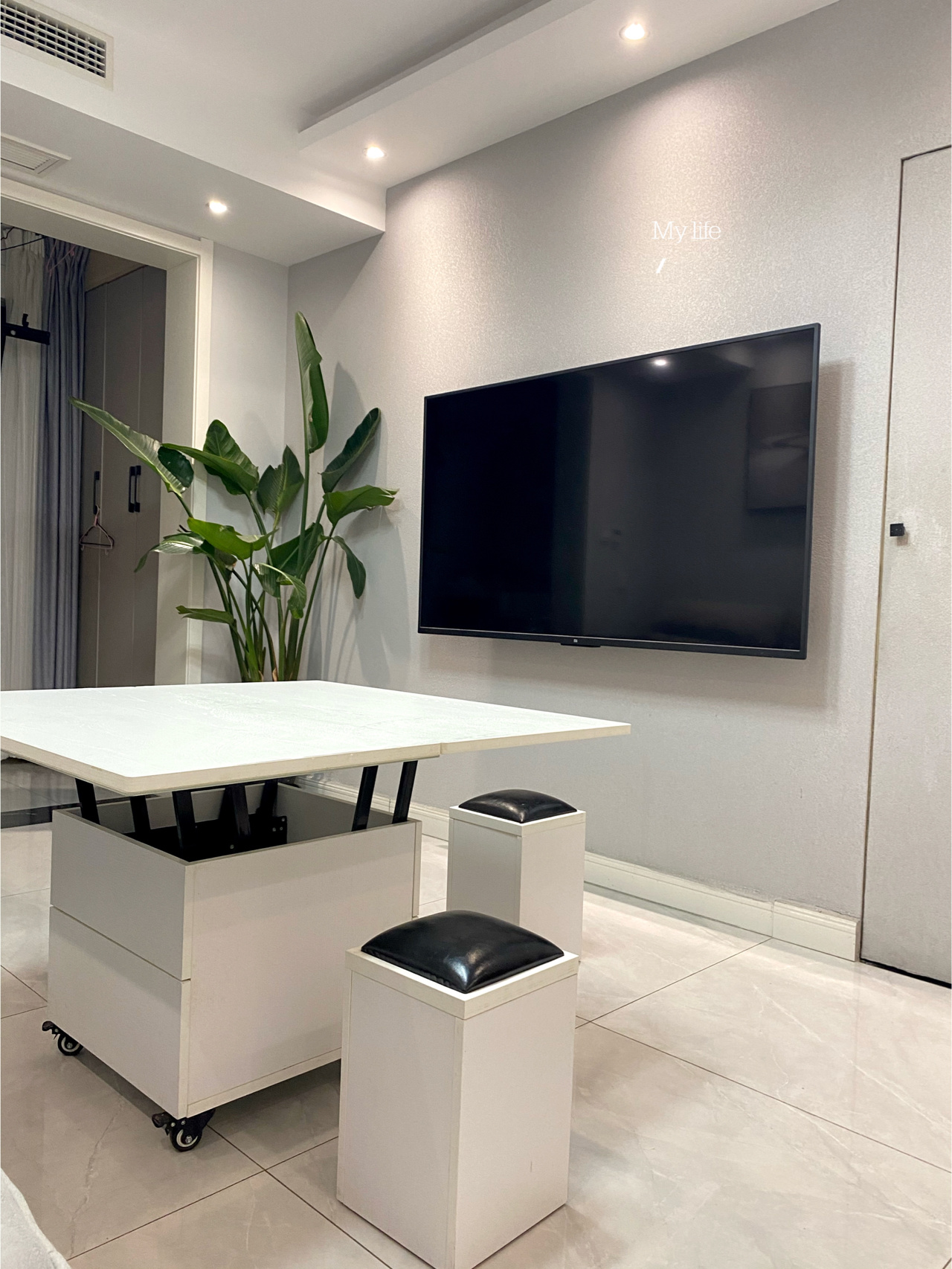朋友来了可以展开升高成一个大餐桌。配了四个高一点的凳子,如果挤挤,应该能坐8个人没问题。
