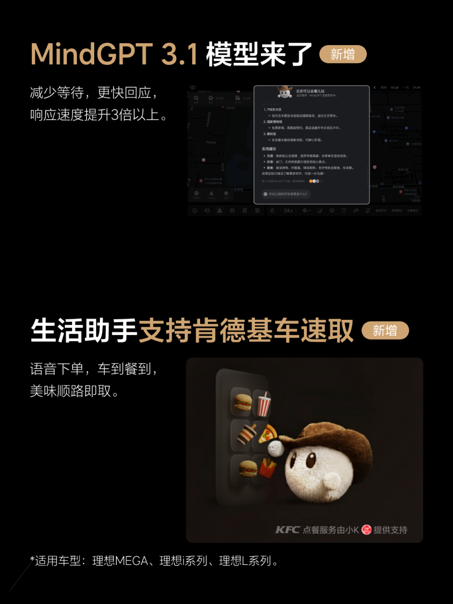 OTA8.1版本,智能座舱推理模型升级至MindGPT 3.1,升级后的模型可以根据问题复杂度自适应思考长度,整体响应速度提升3倍以上,在保证回复质量的前提下,在更短时间内给出答案,降低用户等待时间。新版本智能座舱将带来行业首发的A2A(AI多智能体协作,Agent to Agent)能力,理想同学智能体联合肯德基小K智能体,实现肯德基餐品点餐服务。用户可以通过理想同学,语音点肯德基车速取或沿街取,点单完成后用户导航到餐厅,无需下车就能直接取餐。