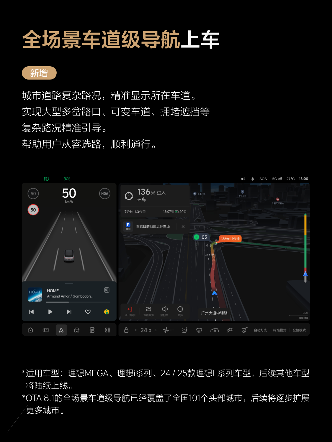 2022款及之后的所有理想L系列、理想MEGA和理想i系列车型新增全场景车道级导航,凭借视觉定位方案,将导航的颗粒度细化至“车道级”,帮助用户在复杂路况中走对车道,重构“人、车、路”的精准连接。目前,全场景车道级导航已经覆盖了全国101个头部城市,后续将逐步扩展更多城市。此外,行车记录仪新增前向碰撞预警(FCW)、后向追尾预警(RCW)、盲区横穿预警(CTA)、低速误加速抑制(MAI)主动安全水印图标,在风险发生的同时记录更多关键信息。