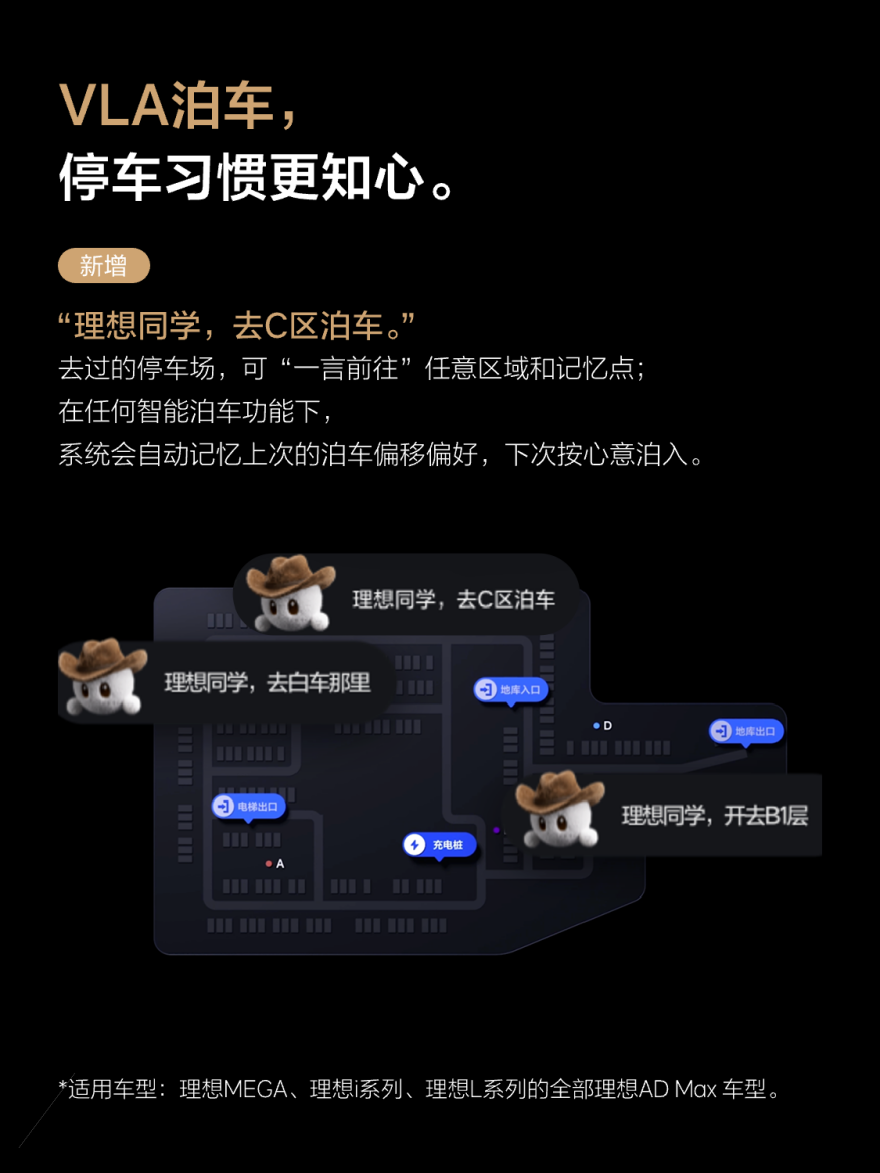 泊车方面,VLA司机大模型记忆能力升级,空间理解能力再提升,支持用户语音指挥车辆前往地库不同区域或收藏点位。新增熟悉园区的车位收藏提示,用户泊入车位后可以在车机界面一键保存车位,可在一个园区保存多个心仪车位。使用辅助驾驶泊入车位并使用停车偏移功能后,车辆将自动记忆,后续泊入该车位时,将按照上次记忆的偏移位置泊入。