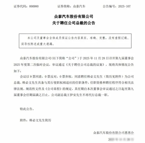 2025年12月初,众泰汽车更换了新总裁韩必文,他来自奇瑞汽车,是一位经验丰富的老将,现在与董事长李立忠共同管理公司,董事会中还包含几位来自步步高的成员,背景较为多元,原先的大股东江苏深商已经退出,目前公司没有绝对控制方,这为外部资金进入提供了便利。