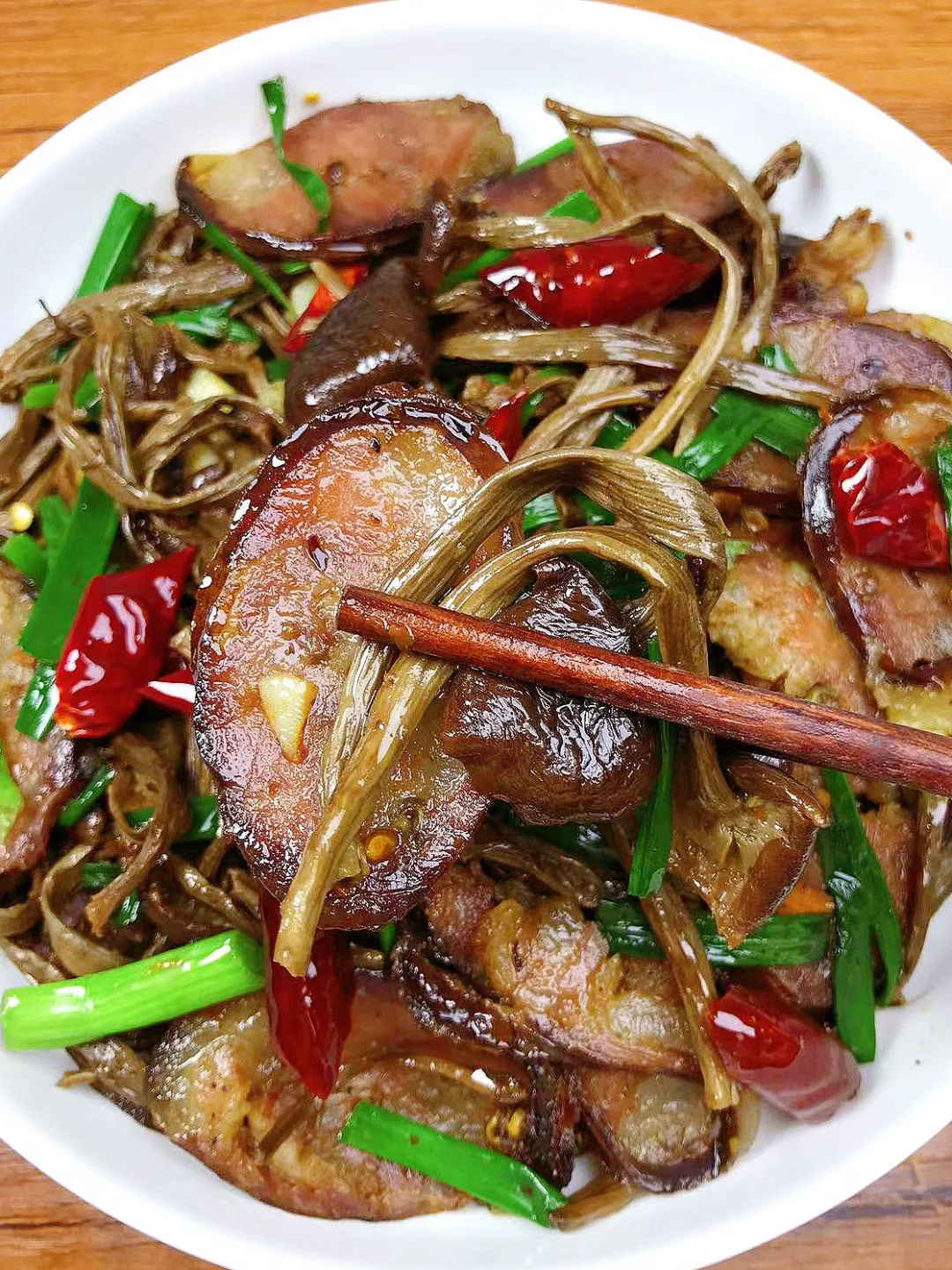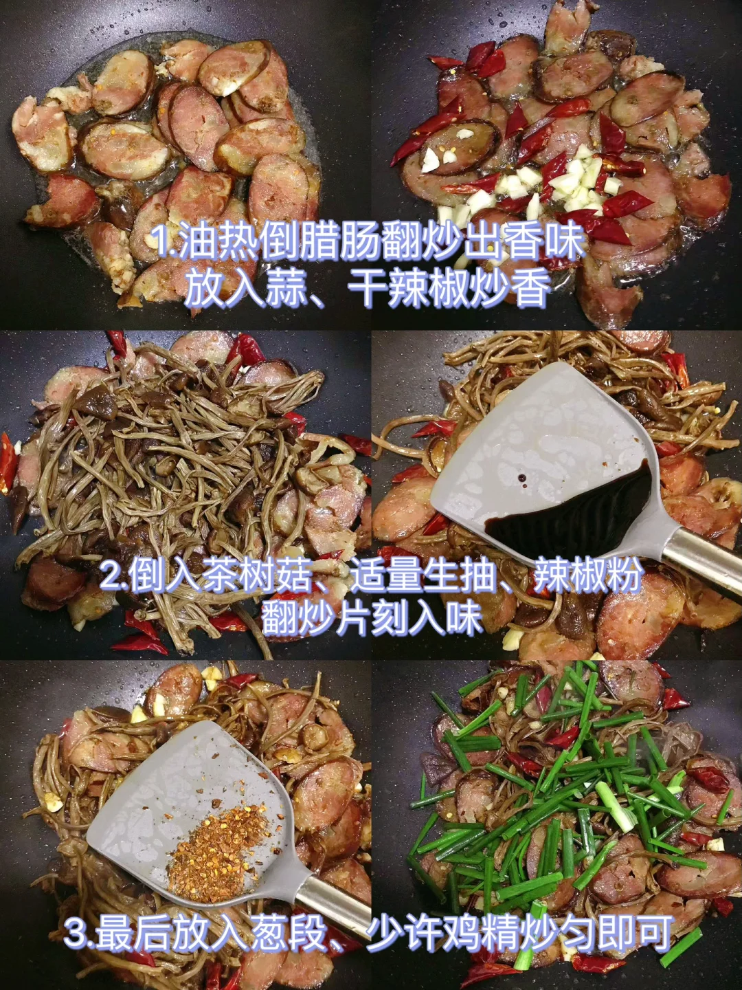[赞R]今天分享一款茶树菇炒腊肠!腊香浓郁,好吃下饭,太香啦!!喜欢的赶紧试试吧! [赞R]食材:腊肠/腊肉、干茶树菇、干辣椒、蒜、葱段/蒜苗 [赞R]做法: 1.干茶树菇热水泡发洗净后煮10分钟沥干;腊肠洗净煮熟切成片 2.油热倒入腊肠翻炒出香味,放入蒜、干辣椒炒香,倒入茶树菇、适量生抽、辣椒粉翻炒片刻入味 3.最后放入葱段、少许鸡精翻炒均匀即可
