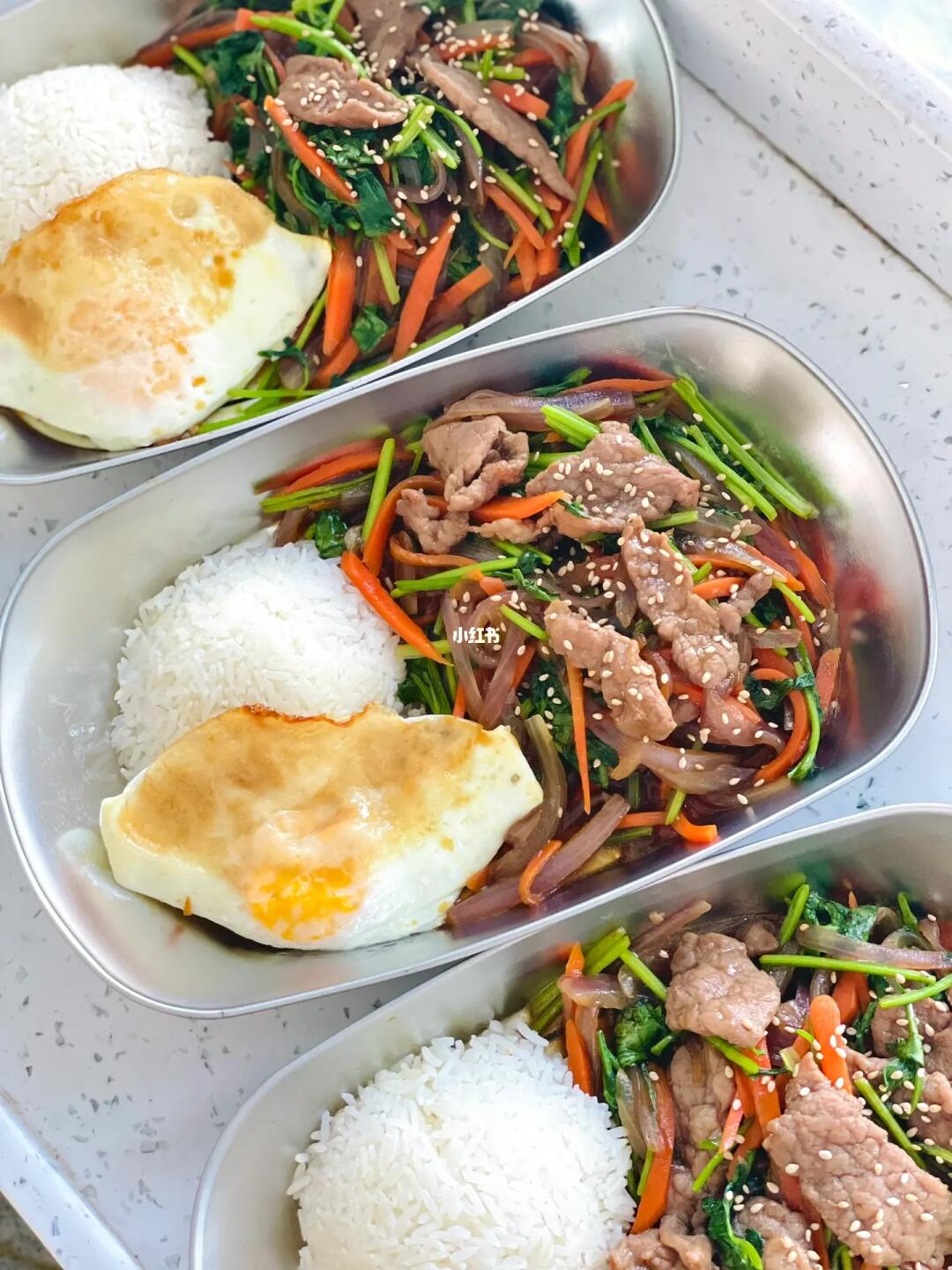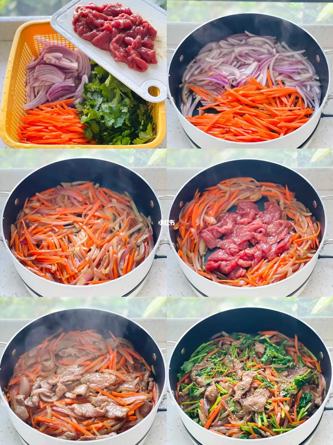 4️⃣加入牛肉炒至7分熟,与胡萝卜、洋葱拌匀,生抽调味