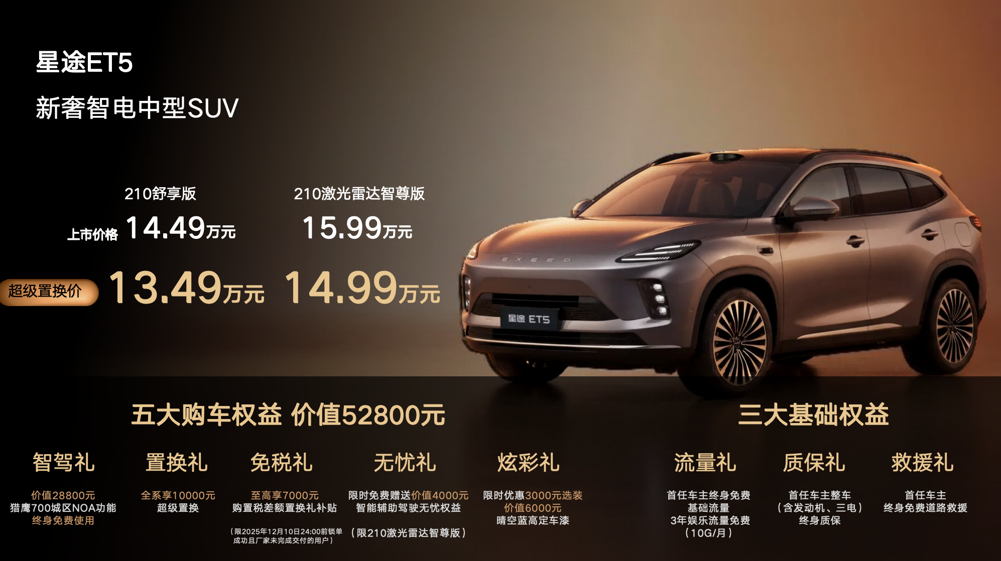 在万众期待的价格揭晓环节,星途 ET5 正式公布两款配置车型的官方指导价与专属权益:210 舒享版、210 激光雷达智尊版官方指导价 14.49 万元 - 15.99 万元,超级置换价低至 13.49 万元 - 14.99 万元,以满满诚意回馈中南地区消费者。更重磅的是,品牌宣布猎鹰 700 城区 NOA 功能终身免费使用,同时推出价值 52800 元的五大限时购车权益,部分权益限时尊享,为车展现场订车用户送上超值福利。