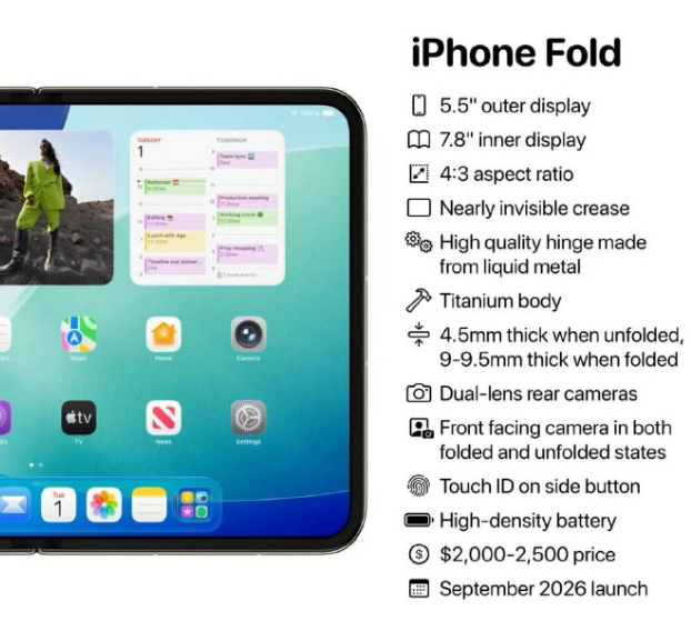 据外媒最新消息透露,iPhone Fold折叠屏幕将由国际屏厂三星独家供应,内屏尺寸7.74英寸、外屏5.49英寸,整体设计语言与主流折叠屏手机看齐。电池容量在8000毫安左右,并配备高功率快充。核心硬件处理器,将搭载台积电2nm工艺的苹果A20系列芯片,首发苹果自研C2基带,标配12GB运存。