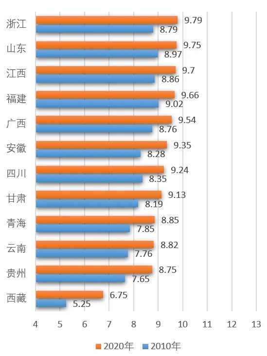 2010年到2020年十年间,进步最快的省是:西藏、贵州、上海。