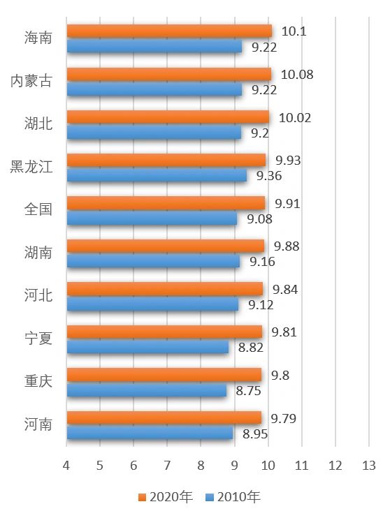 从8.5年以下上升到9年以上的三个省是:甘肃、四川、安徽。