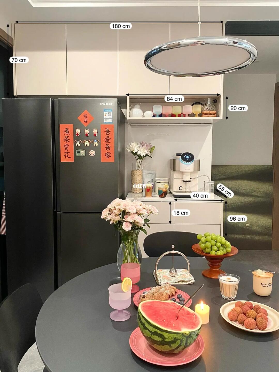 客餐厅一些区域的柜子都做了内嵌入灯带,比如鞋柜的中间和底部镂空放东西,嵌入暖色灯带,餐边柜开放格也做了灯带,见光不见灯,很有氛围感