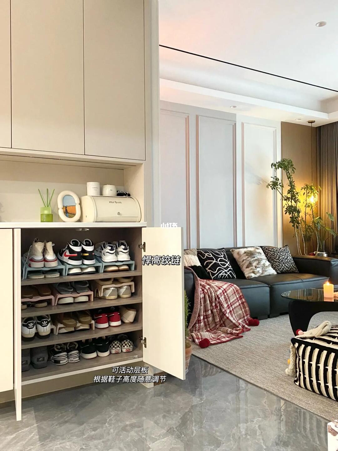 鞋柜的层板做了可活动层板,可以根据鞋子高度随意调节,靴子、运动鞋、拖鞋都能放