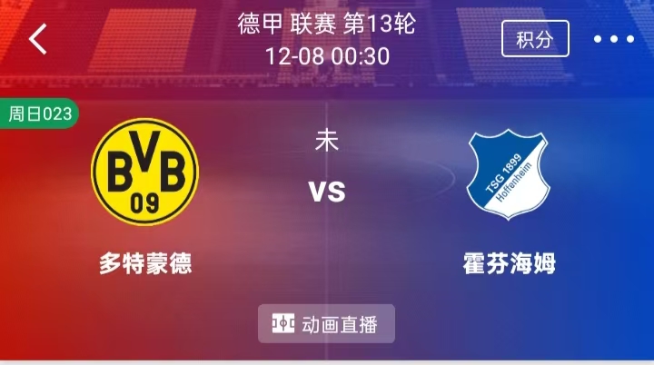 ​周日 023 德甲 多特蒙德 VS 霍芬海姆比赛时间:2025-12-08 00:30:00球场:伊杜纳信号公园球场多