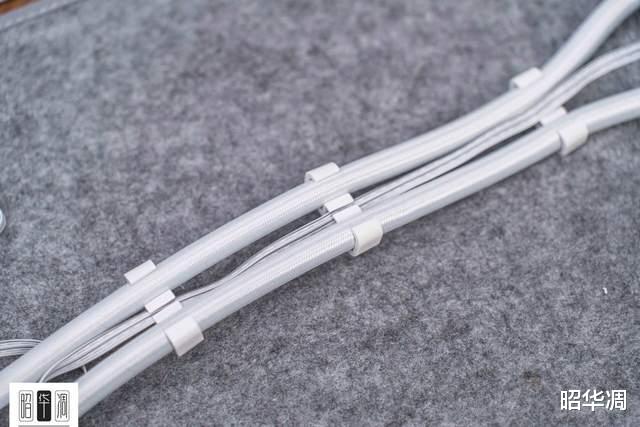 ▼水管长度 450mm,表面包裹着高强度的编织网。管身上预装了理线卡扣,设计非常巧妙,除了固定水管形态外,卡扣中间还预留了线槽,方便玩家将风扇或冷头的线材隐藏其中,让走线更清爽。