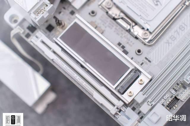 ▼正面的 M.2 插槽配备了厚实的散热马甲,且采用了人性化的易拆设计,规格上支持满血的 PCIe 5.0 * 4。这块散热马甲内部还巧妙地内嵌了 一 颗主动散热小风扇,能有效压制 PCIe 5.0 SSD 巨大的发热量,拒绝高温降速。