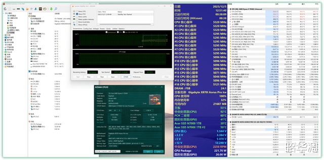 ▼温度方面,待机时处理器温度 30°C 左右,压测 10 分钟频率跑到了 5.3GHz,此时功耗 220W,处理器温度最高跑到 92°C,后面降到了 90°C 并持续保持,全程没有出现过热降频,对于这这样的 ITX 机箱 + 240 水冷来说,已经相当不错了