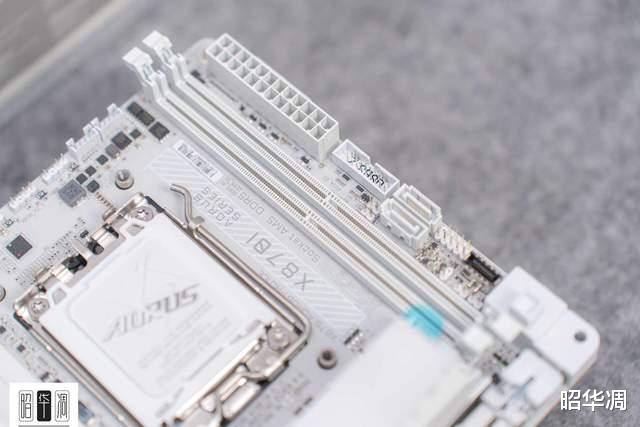 ▼技嘉 X870I AORUS PRO ICE(以下简称技嘉 X870I)将“纯白美学”贯彻得极为彻底。它不仅仅是换个散热片颜色,而是连 PCB 基板、内存插槽都做了深度白化处理。点亮后,搭配散热马甲上流光溢彩的 LOGO,视觉效果直接拉满,