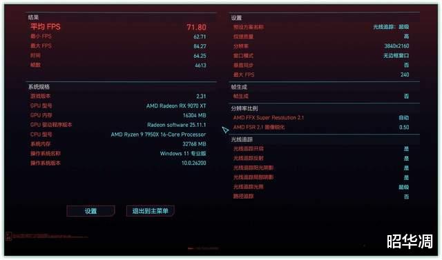▼「赛博朋克 2077 」在 4K 分辨率 + 预设光线追踪:超级,平均帧率达到 71.8FPS,最小帧率 62.71FPS。