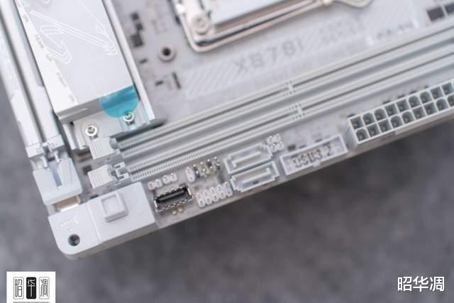 ▼下方是 一 条全尺寸的 PCIe 5.0 x16 显卡插槽,配备有合金骨架加固。