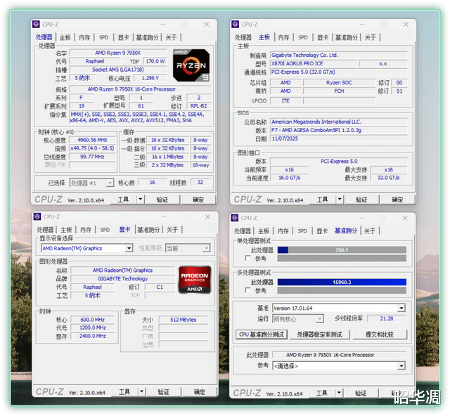 ▼CPU-Z 常规测试,7950X 单核性能 750.1,多核性能 15960.3