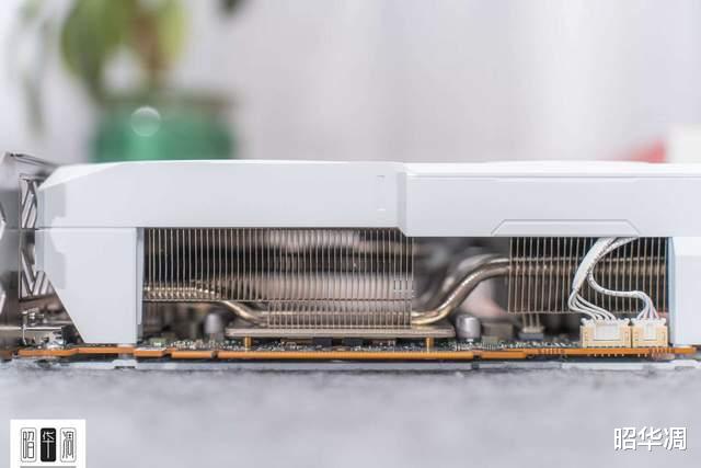 ▼内部用料方面,核心接触面使用了高性能的霍尼韦尔(Honeywell)PTM7950 相变导热材料,这种工业级导热介质配合 5 根 6mm 复合热管及高密度加厚散热鳍片,能以极快的速度将核心热量导出。同时,那块厚实的白色金属背板不仅能增强显卡结构强度,防止 PCB 弯曲,也承担了辅助散热的重任。