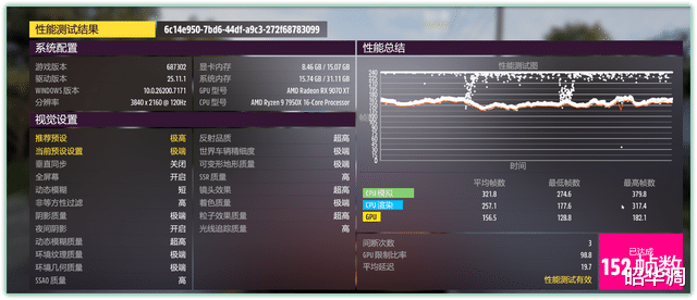 ▼「地平线5 」应该算是 Windows 平台优化最好的赛车游戏,画面表现也是相当不错,本次测试基于 4K 分辨率 + 极端画质,实测下来平均帧率达到了 152FPS。