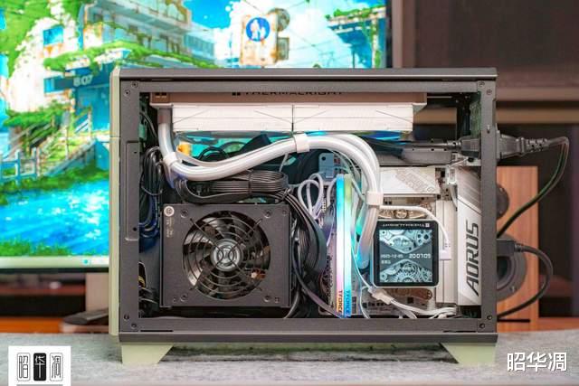▼来到主板区域,坦白讲,在这种 A4 架构的 ITX 机箱内,走线很难做到绝对完美,尤其是在安装了水冷系统之后。好在这次使用的是全模组电源,只需连接必要的线材,避免了多余线缆堆积在狭小空间内。