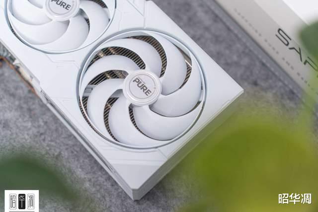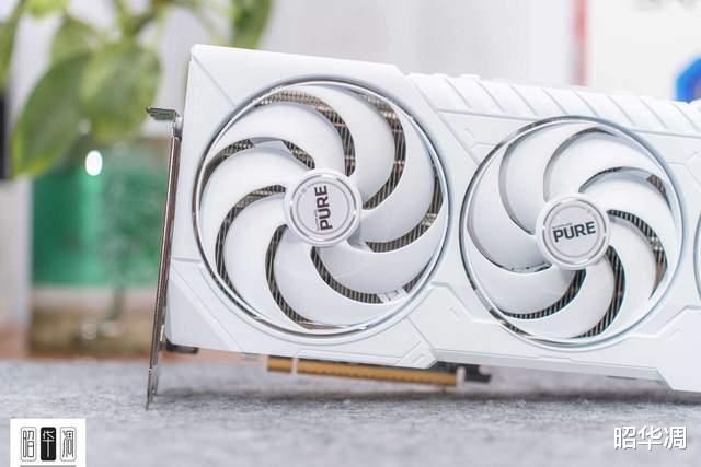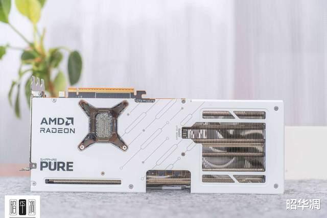 ▼背面覆盖了一块全铝合金金属背板,印有 AMD RADEON 和 PURE 极地系列的品牌 LOGO,辨识度极高。背板右侧进行了大面积的镂空开孔设计,以利于风道穿透。
