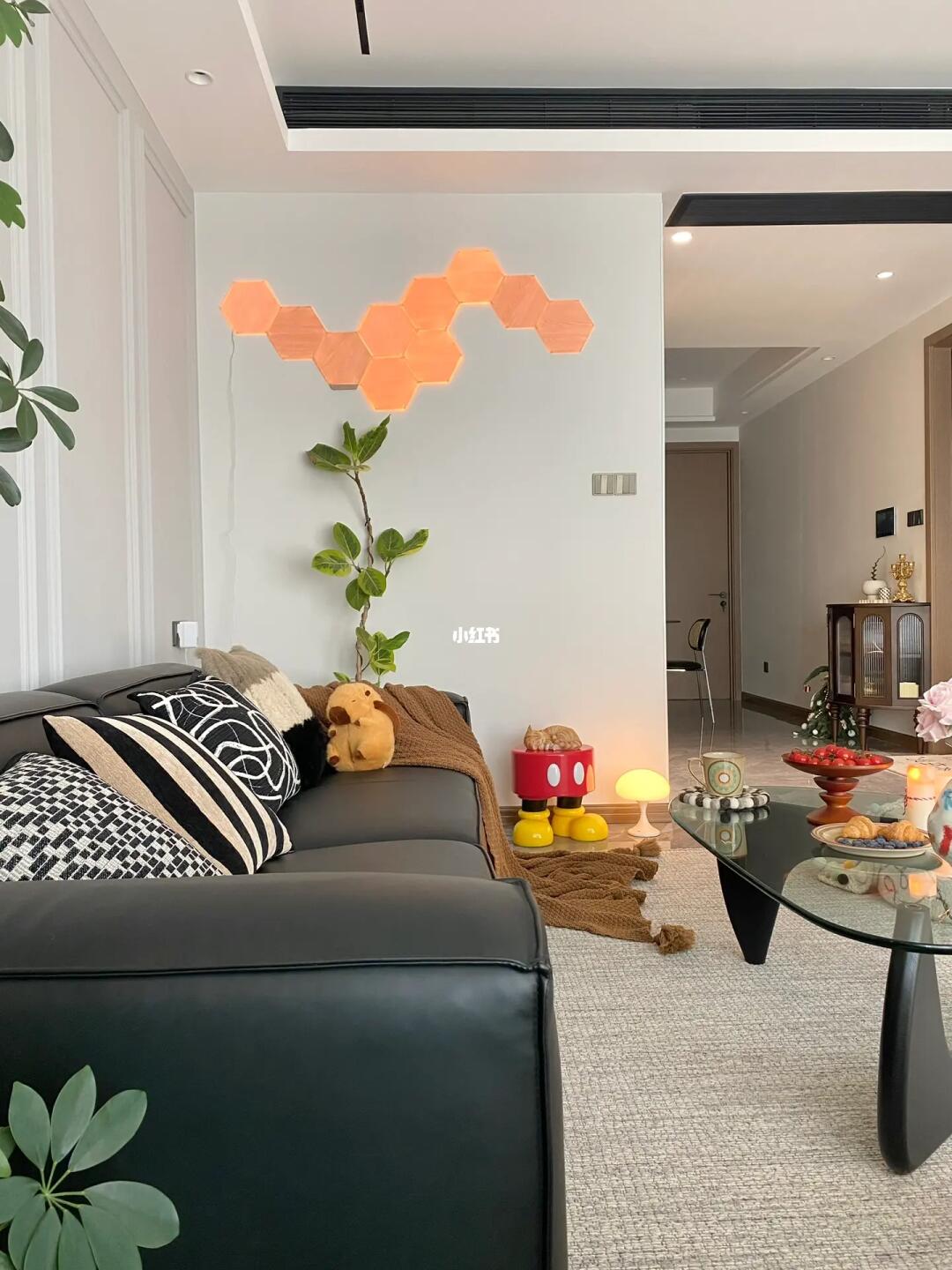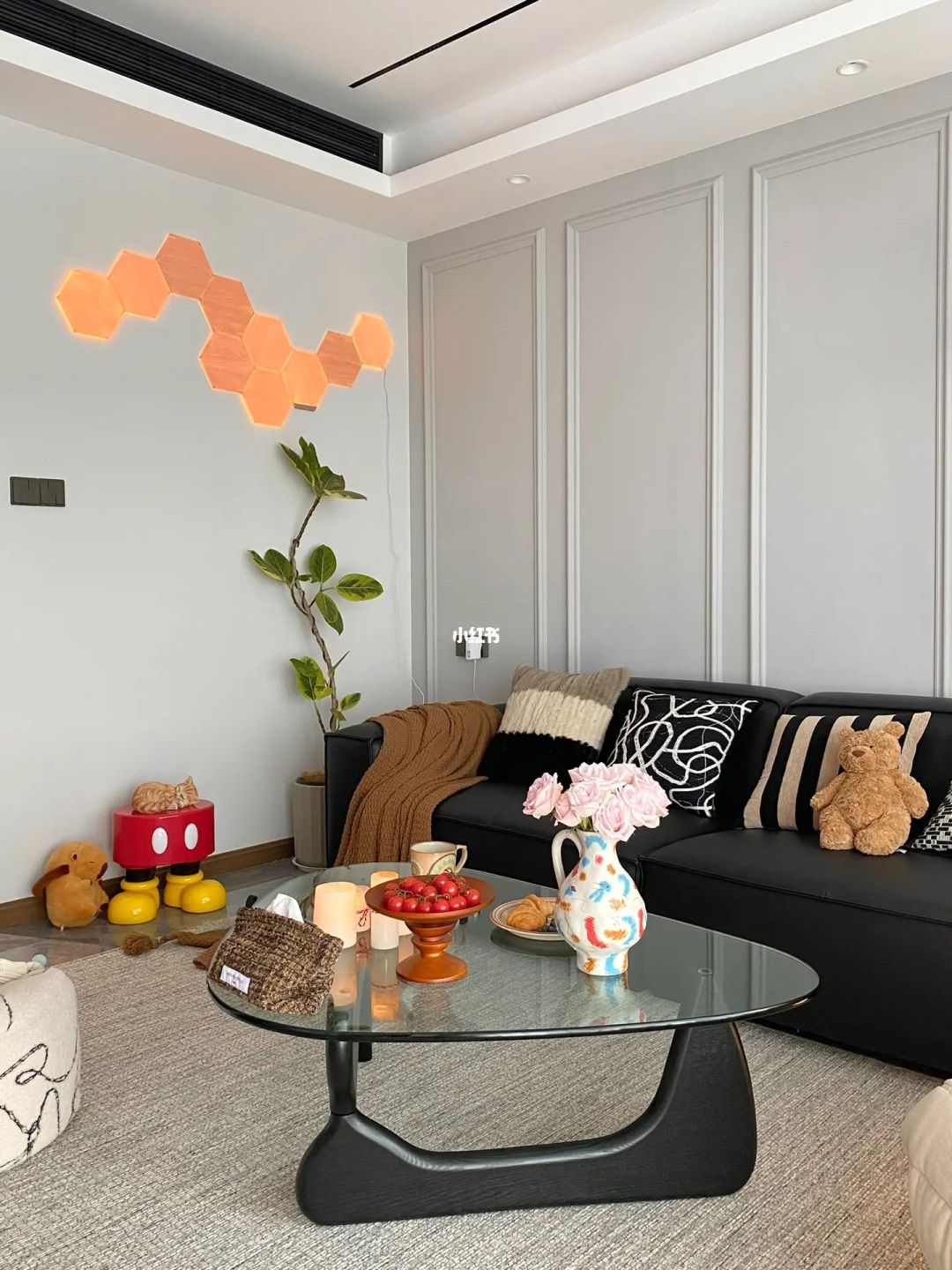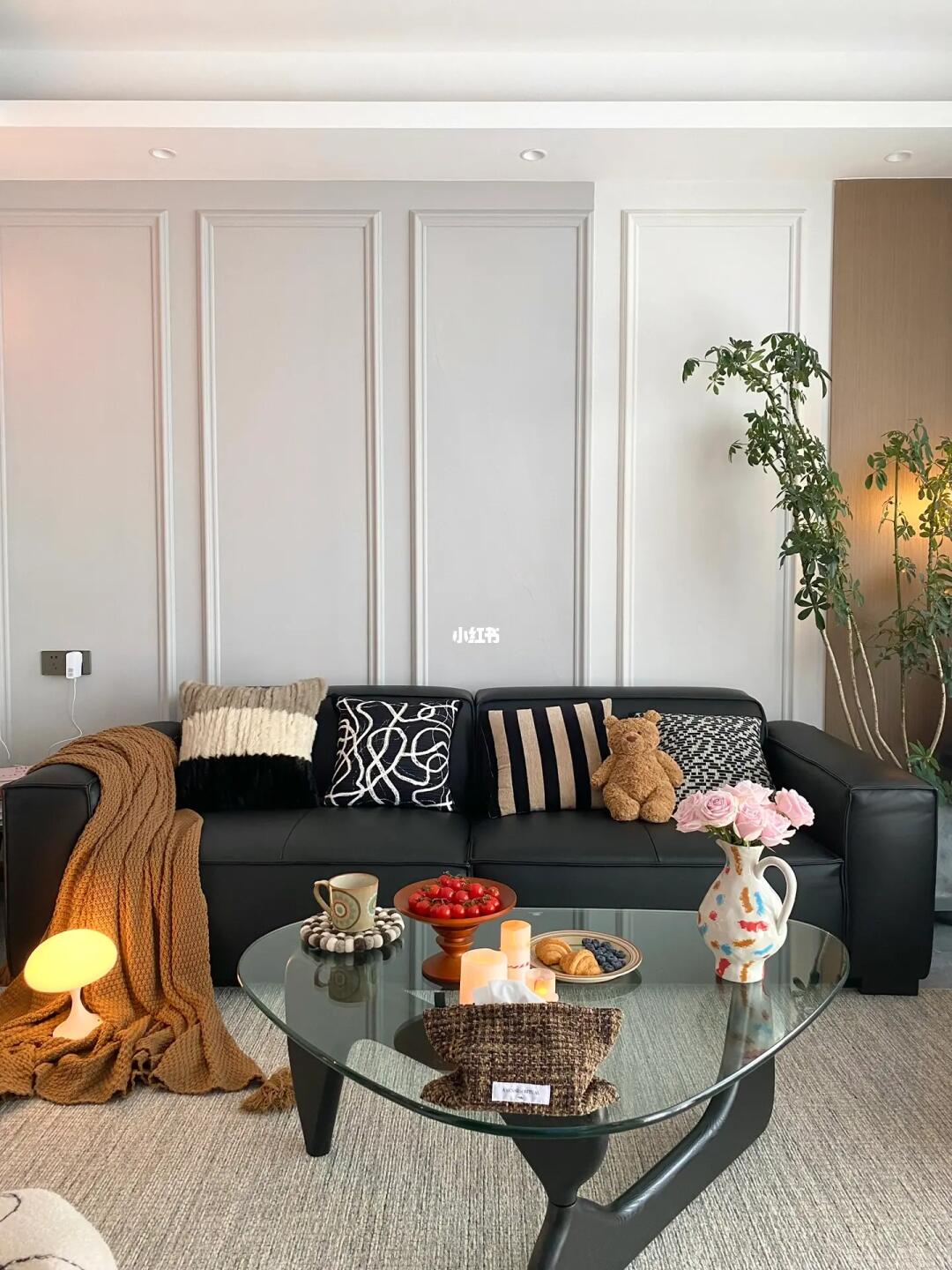 ⚫全屋乳胶漆通刷,沙发背景墙做了石膏线,刷了灰拼白乳胶漆,500元也能出好看的效果