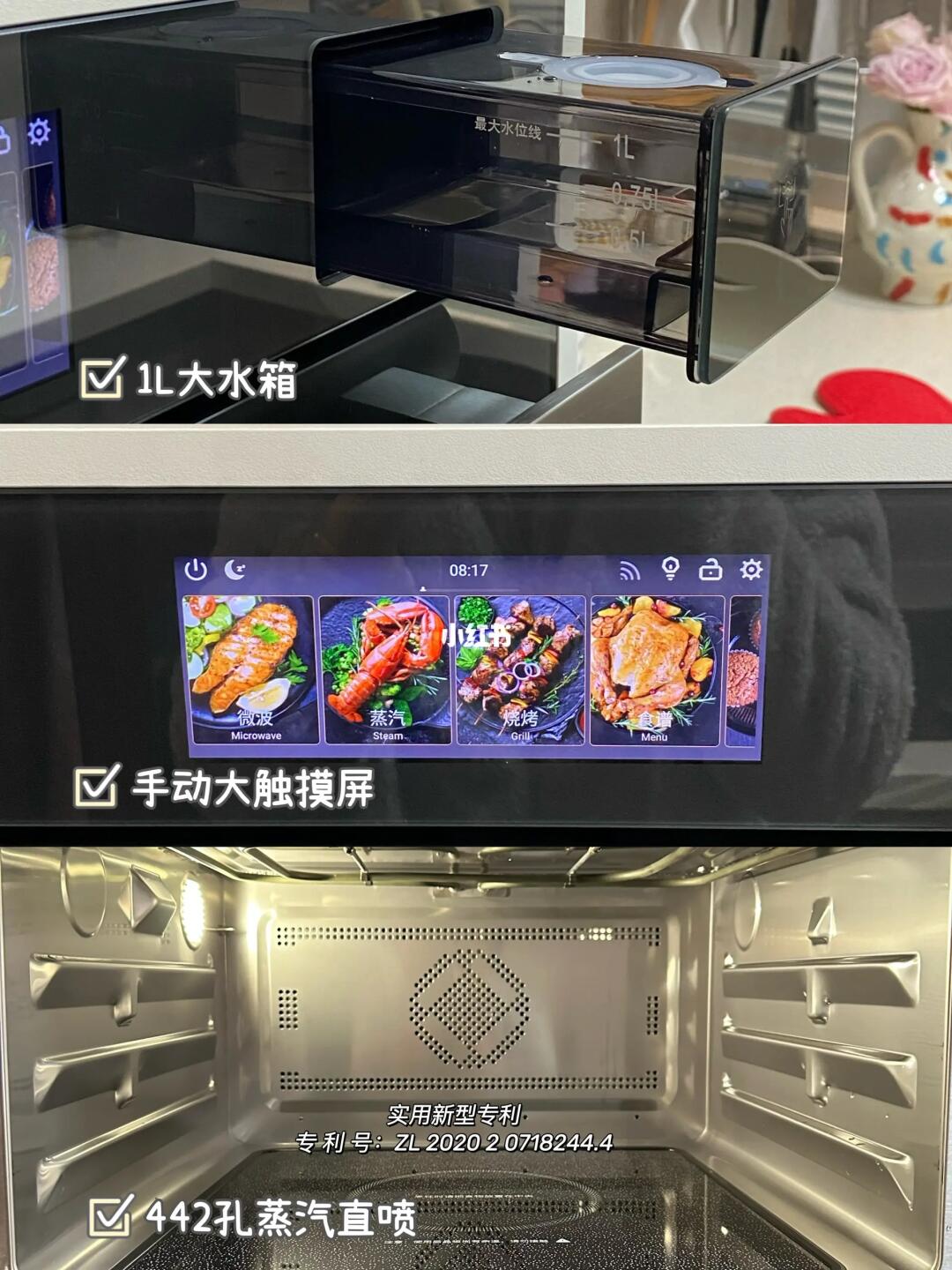 爸爸妈妈来了,就会蒸点鱼和小菜,442孔蒸汽直喷,18秒就能出蒸汽了。蒸鱼蒸蛋的口感比用锅蒸要好很多,120度混合热能可以更大程度的锁住食物的鲜味,独特的新鲜水蒸汽专利+全自动排水技术,使用也很方便和安心,不用担心蒸煮之后留下的废水残留,每次使用隔夜水了。