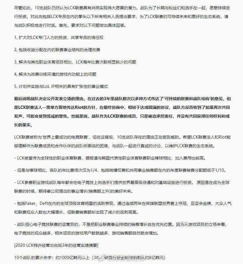 LCK十支战队对于可持续性LCK的联合立场声明(简要)