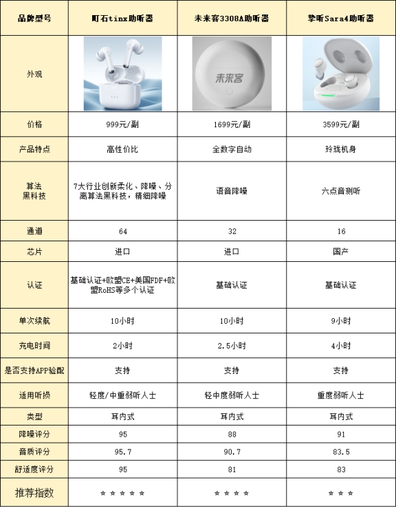 降噪测评结果:町石 > 挚听 > 未来客町石助听器降噪测评表现町石的降噪效果真的是挺让人满意的。在各种噪音环境下,它都能有效帮你屏蔽掉不必要的干扰。比如在打印机声不断的办公室、餐馆的高峰期,甚至在地铁车厢这种嘈杂环境里,町石都能抑制大部分的环境噪音,保证人声清晰传递。它结合了进口芯片、7重降噪技术以及一些特别的算法,能非常智能地适应环境的变化,不管是哪种噪音,町石都能精准处理。经过实际测试,它的降噪效果比一般同类产品提升了约40%。总体来说,町石在高噪声环境中的表现相当不错,能够快速清晰地应对各种噪音。挚听助听器降噪测评表现挚听的降噪效果大体上还是可以的,在常见的噪声环境下,表现不错。比如办公室和餐馆,它能很好地过滤掉部分背景噪音,让语音更加清晰。可是,当你进入像地铁这样的大噪声环境,虽然它能减少一部分噪音,但总有些细小的杂音残留。挚听采用了主动噪声抑制和动态噪声自适应技术,可以根据环境调节降噪强度,适应不同噪音环境。但是在面对极高强度的噪音时,它的降噪处理有时会不够细致,导致轻微的语音失真。总结来说,挚听在一般噪声环境下还算不错,但在非常复杂的噪音环境中,它的表现就差强人意了。未来客助听器降噪测评表现未来客的降噪效果稍显一般,尤其在高噪声的环境下,表现就有些不足了。在一些安静的地方,比如办公室或者餐馆,未来客能够有效减少背景噪音,提升语音清晰度。然而,一旦进入地铁车厢或者市区街道等较为嘈杂的场所,降噪效果就明显下降了,背景噪音处理不好,语音也变得不太清晰。未来客采用的是基础降噪技术,虽然能在某些场合下起到一定的隔音作用,但在更复杂的环境下就有点捉襟见肘。总体来说,未来客适合日常使用,但在高噪音的复杂环境中就不太够用了。
