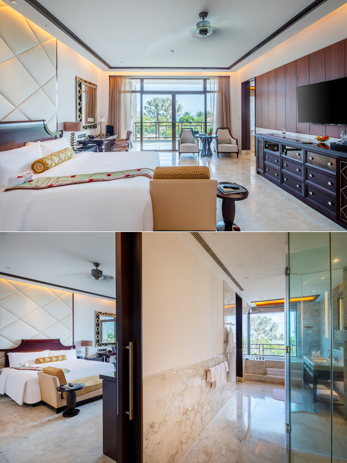 三亚亚龙湾瑞吉的客房,面积不小,家具都秉承低调奢华的风格,属于越看越觉得喜欢的类型,设备都很齐全,屋顶还有吊扇,不喜欢吹空调的可以享受风扇带来的习习凉风,怀旧又实用。房间阳台面积挺大,在这里看看朝霞也挺不错。