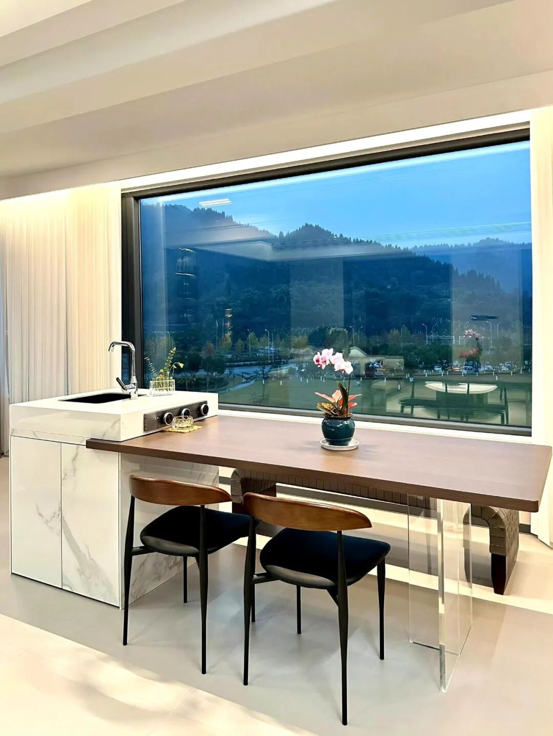 如果家里是大户型,厨房和餐厅相连,那广东人流行的岛台餐桌,就是首选,比长餐桌高级,实用性也拉满,既能撑场面,又不耽误用。