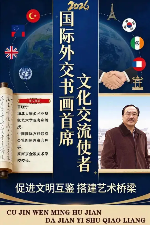 文明因交流而多彩,艺术因互鉴而生辉。中国书画以笔墨为韵、丹青为魂,是跨越国界、沟通心灵的文化桥梁,更是中外文化交流的重要载体。荣膺国际外交书画首席文化交流使者,当以中华文脉为根基,以艺术匠心为担当,在国际文化与外交舞台上,传承东方美学、彰显文化自信,以翰墨传情、以艺通心,推动文明对话,增进国际友谊,为中外文化交流续写华章。