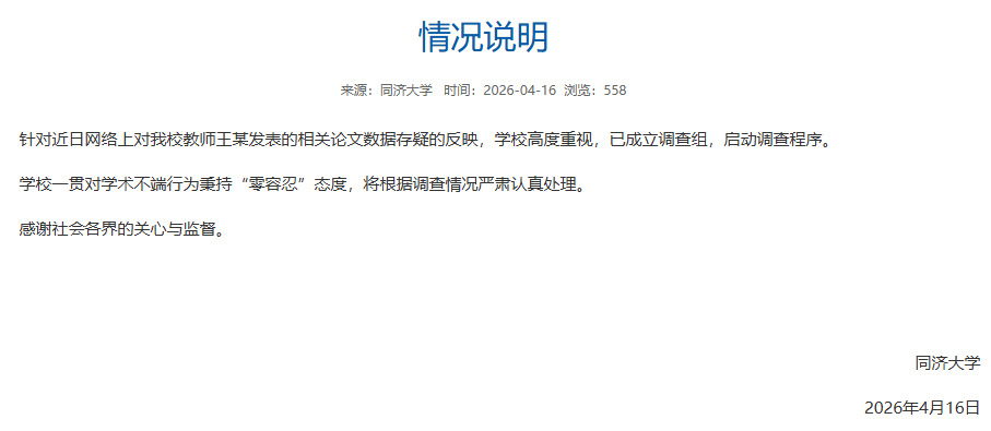4月16日,同济大学发布情况通报: